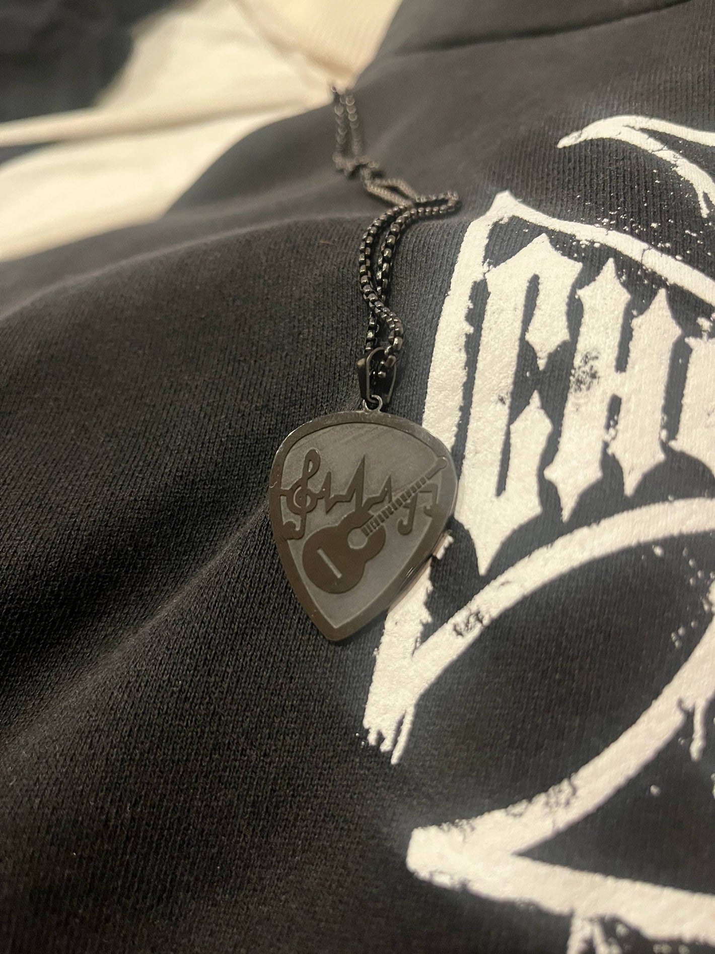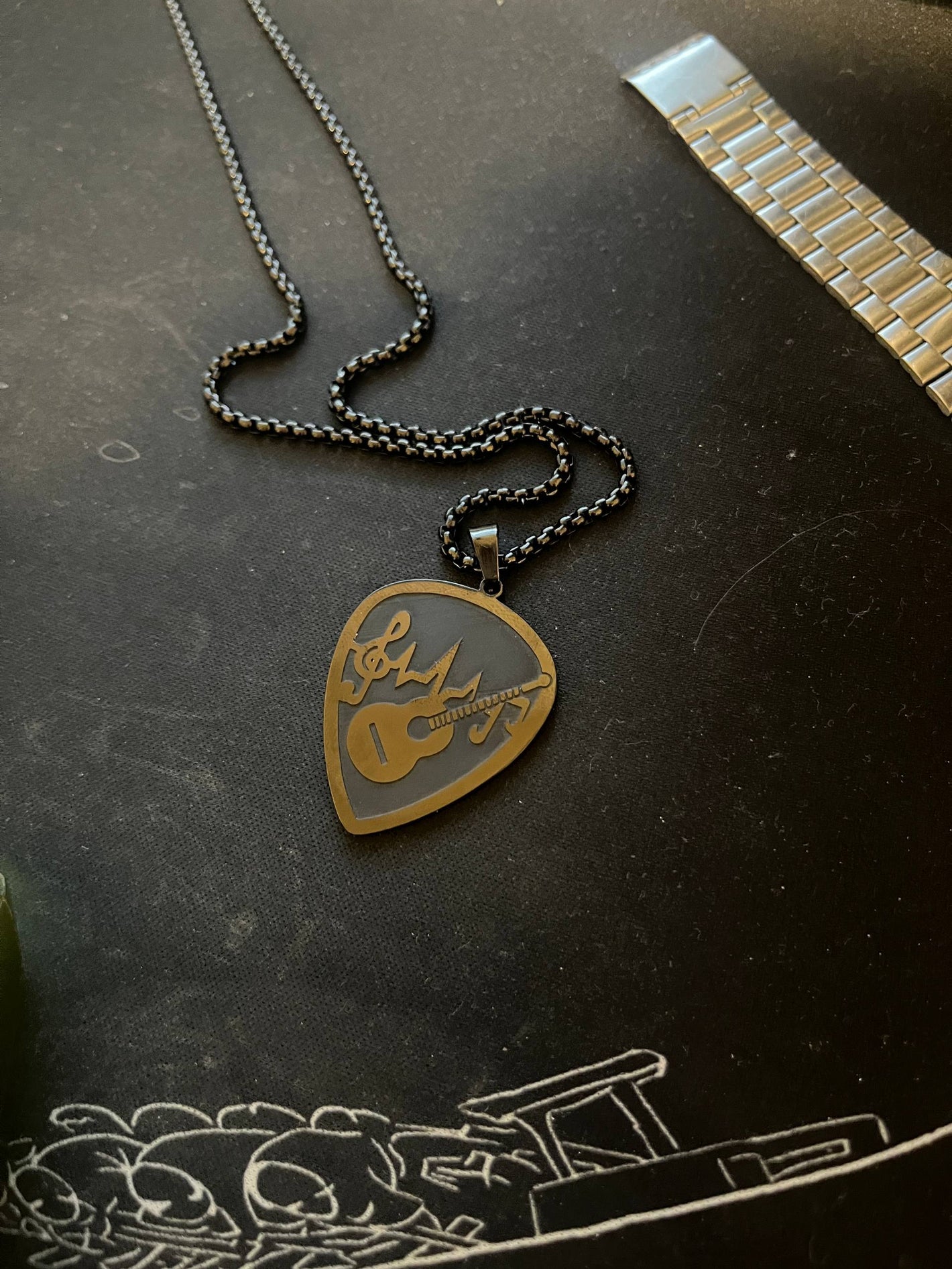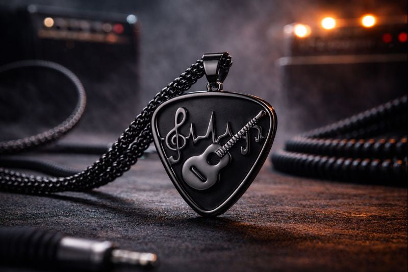 We take a solid steel guitar pick, engrave it with a clean music pattern, polish it, and turn it into a necklace so it stays with you at all times 🎶